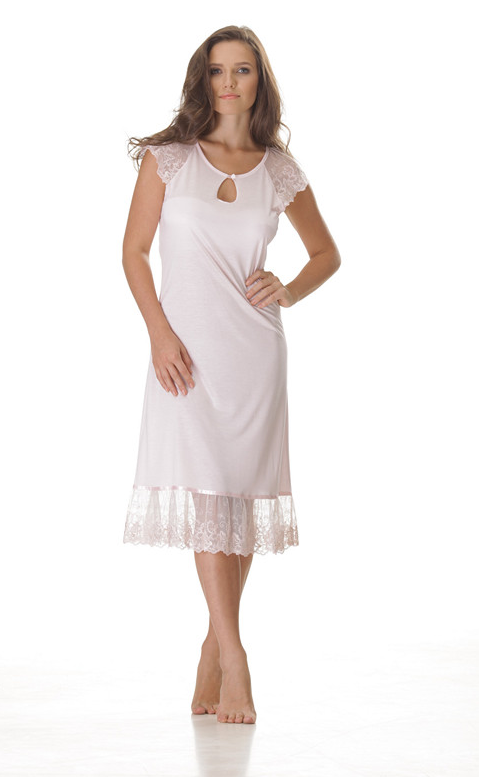 полуприлегающего силуэта с вырезом “слёзка”, украшенный декоративной розочкой. Рукав- реглан и рюша по низу сорочки из кружева.