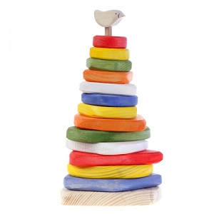 Пирамидка состоит из 13 различных колечек нессиметричных форм. Пирамидка яркая, но покрытие не закрашивает природного рисунка дерева, замечательная игрушка начиная с 2 лет для правильного восприятия форм, размеров и цветов.