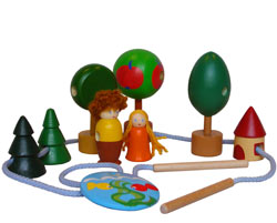 Шнуровка-сказка, всего 8 фигур (деревья, мальчик, девочка, озеро, домик), которые можно использовать и для самостоятельной игры по сюжету. Максимальная высота фигурки 6.5 см. Отличное качество росписи, знакомое ценителям работ мастерской Вальда.