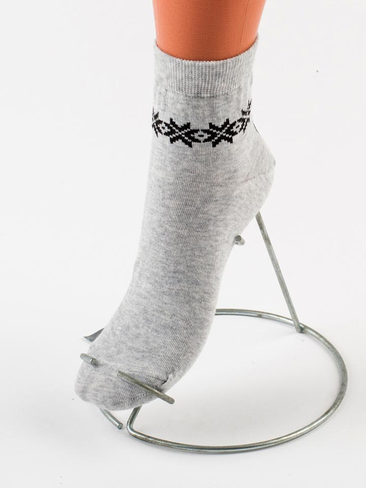Женские носки средней длины цвета серый меланж с орнаментом. Состав: гребенной длинноволокнистый хлопок с добавлением полиамида и эластана для эластичности и комфортной посадки. Такие носки идеально подходят для повседневной носки. Мягкая двойная анатомическая резинка не сдавливает голень и сохраняет в норме циркуляцию крови в ногах, а усиленные двойной нитью пятка и мысок обеспечат долгую службу изделия.