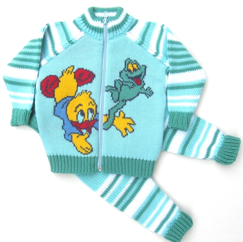 Костюм с жаккардовым рисунком на полочке, полосатыми рукавами и спинкой. Штанишки вывязаны по контуру, пояс провязан спандексом.