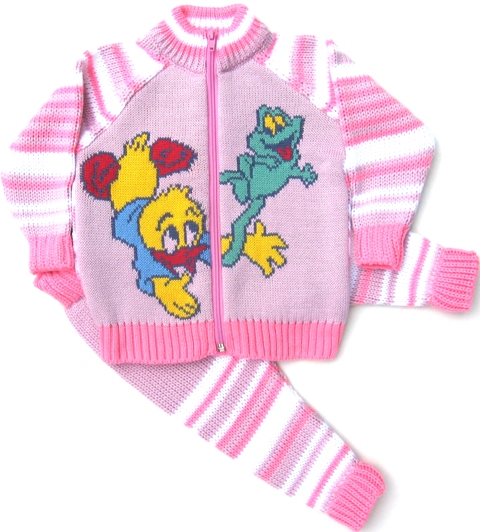 Костюм с жаккардовым рисунком на полочке, полосатыми рукавами и спинкой. Штанишки вывязаны по контуру, пояс провязан спандексом.