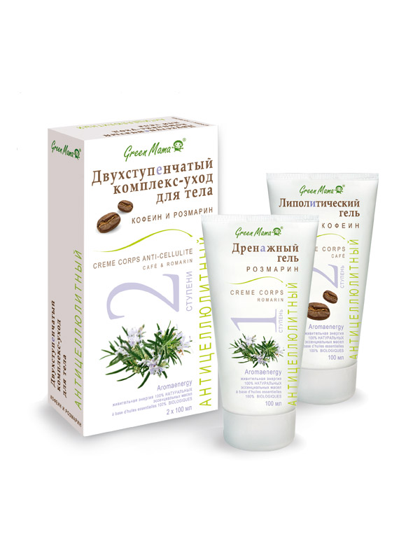 Лаборатория Green Mama создала специальный комплекс - двойной уход для эффективной борьбы с целлюлитом. Массажный гель для укрепления кожи на основе морских водорослей и натурального масла розмарина избавляет от излишков жидкости, которая застаивается в жировых клетках. Это - первый этап, который подготавливает Вас к последующему специализированному глубокому уходу. Липолитический гель на основе кофеина активизирует расщепление подкожных жировых отложений.