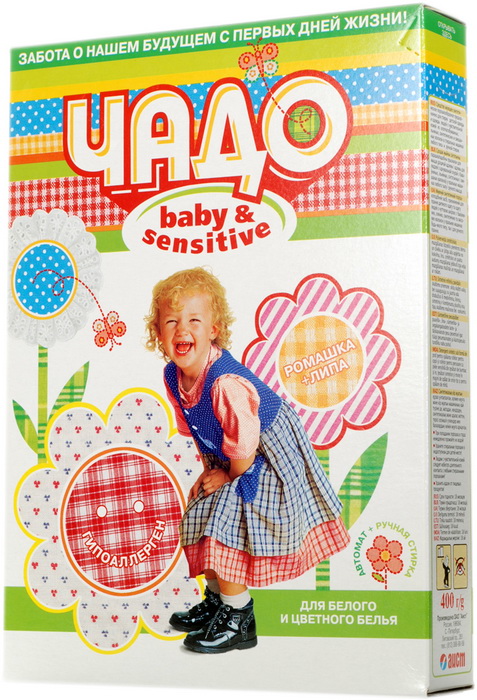 Стиральный порошок нового поколения "Чадо" baby & sensitive специально разработан для стирки детской одежды, в том числе пеленок и белья детей первого года жизни, и одежды людей с чувствительной кожей из различных тканей, в т.ч. деликатных (от белых до темноокрашенных, специально обработанных, с покрытиями, аппликациями и т.д.).
